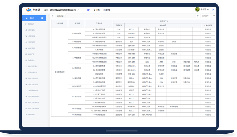 为企业提供多机构多组织的集团化管理,简历规范的职务体系;进行组织的拆分合并以及人员编制的规划,提供完整的账号权限控制。